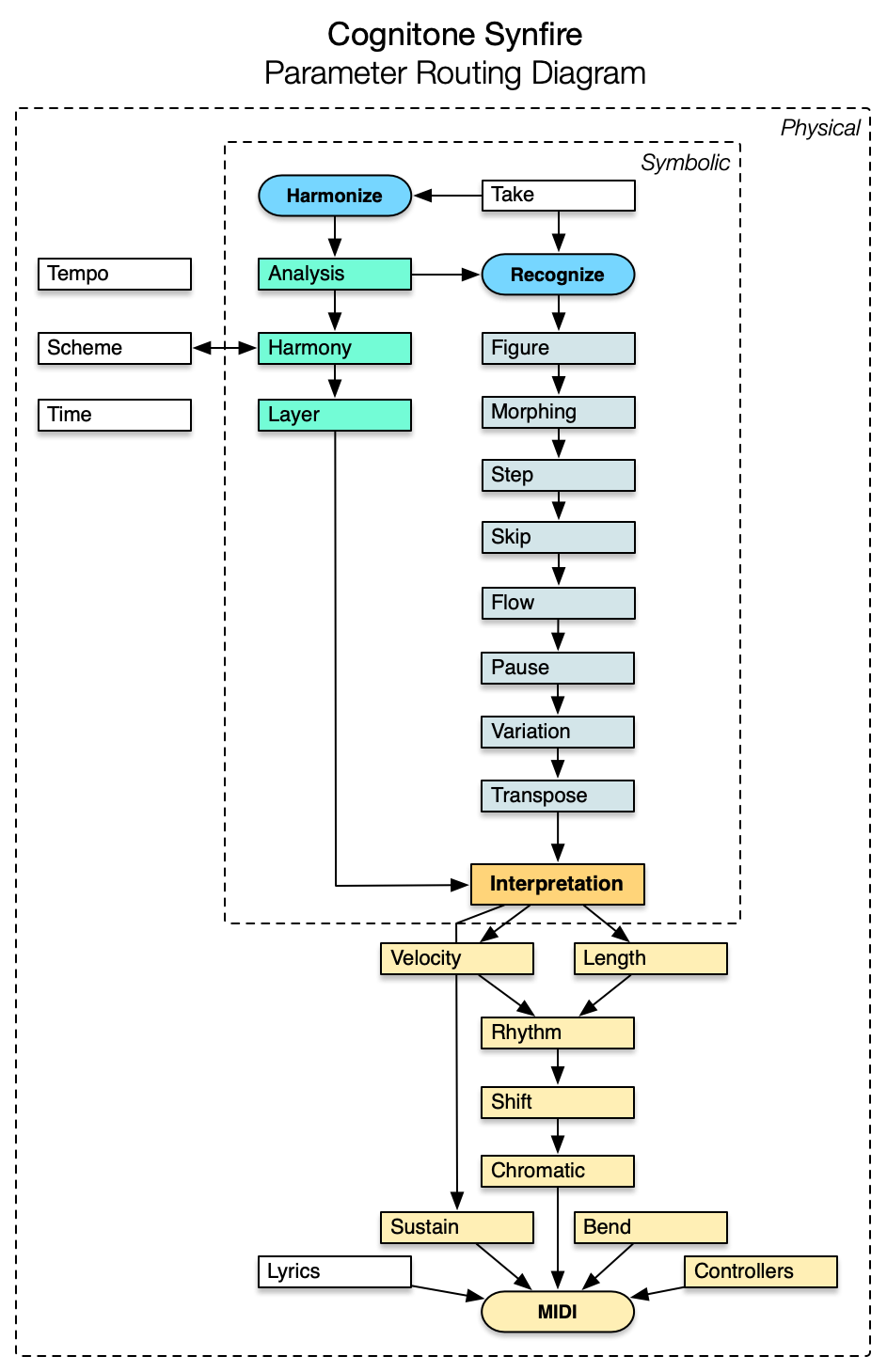 Die Parameter beeinflussen sich gegenseitig auf eine bestimmte Art und Weise, die im folgenden Diagramm dargestellt ist. Es gibt symbolische Parameter, die die Musikkomposition auf einer höheren Ebene steuern, und physische Parameter, die hauptsächlich die MIDI-Ausgabe in einer späteren Phase des Rendering-Prozesses manipulieren.