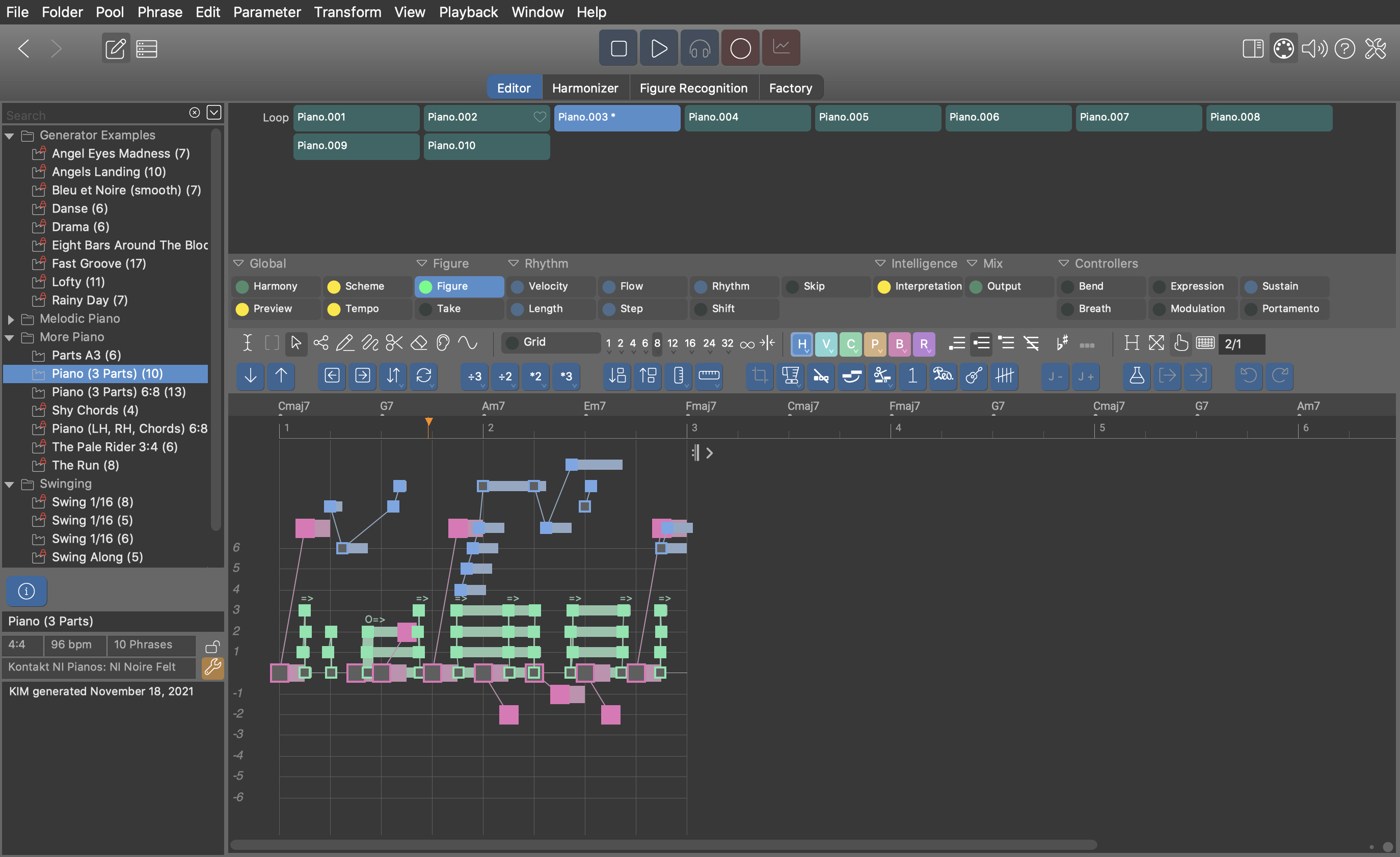 Der untere rechte Abschnitt ist ein regulärer Phrasen-Editor zum Bearbeiten der aktuell ausgewählten Phrase im Pool. Vier Seiten Editor, Harmonizer, Figurerkennung und Factory widmen sich speziellen Aufgaben, die damit zusammenhängen.