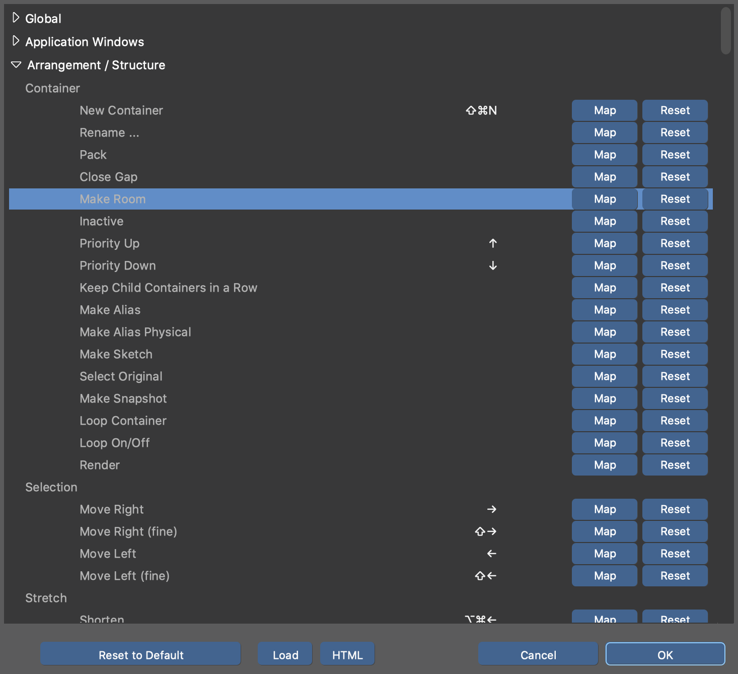 - Klicke, um den Befehl neu zuzuordnen. Die Beschriftung blinkt, während Synfire auf Tastatureingaben wartet. Eine Warnung wird angezeigt, wenn der Befehl bereits einem anderen Befehl zugeordnet ist.
