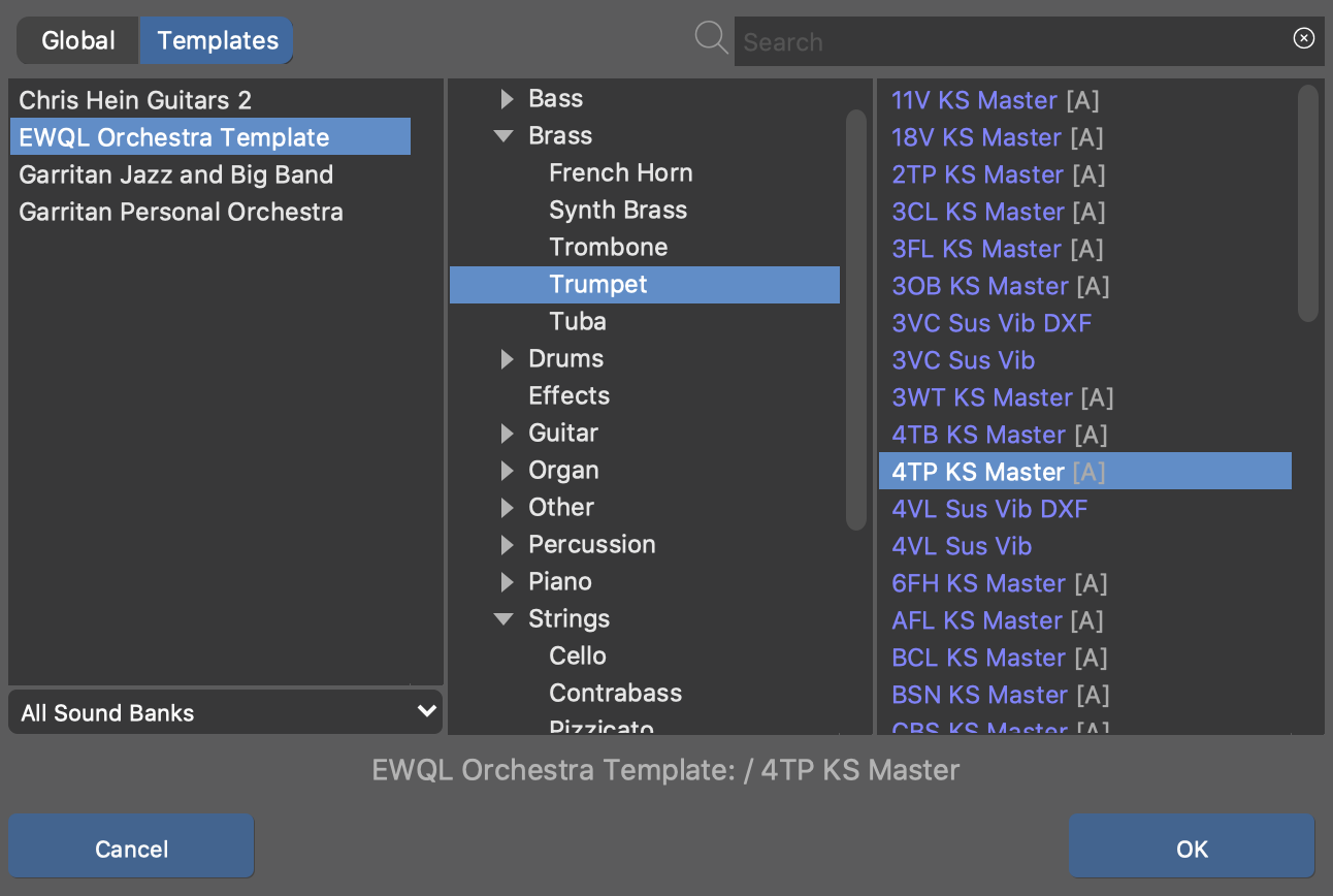 Dieser Browser öffnet sich, damit du die Eigenschaften eines Sounds nachschlagen kannst, der von Gerätevorlagen bereitgestellt wird. Wähle eine Vorlage aus der Liste aus, um ihre Eigenschaften in den Sound zu kopieren, den du gerade bearbeitest.