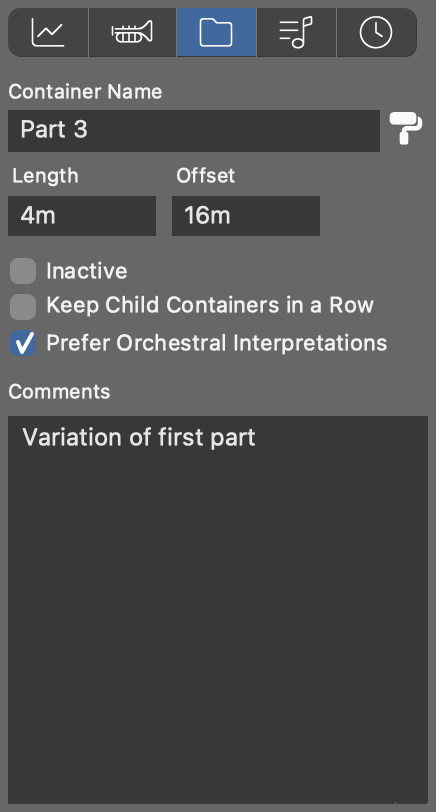 - Position, an der der Container beginnt, bezogen auf die Taktart des übergeordneten Containers (Scheme). Erlaubt jeden Ausdruck für eine Dauer, z. B.