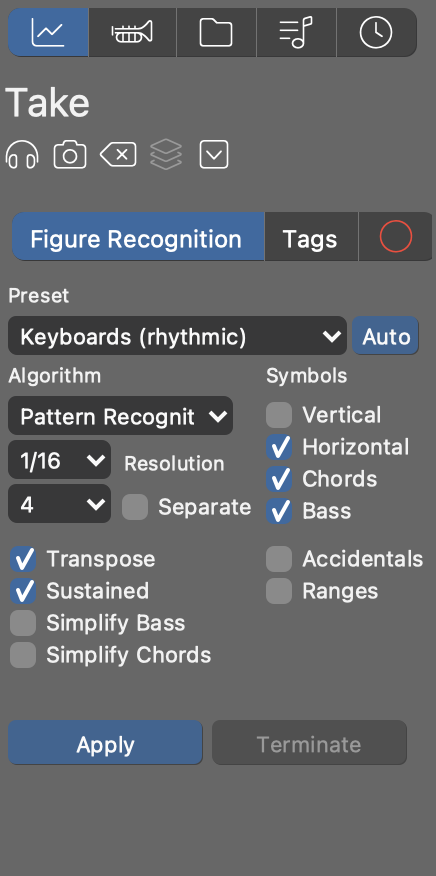 Der Take-Parameter hält deine zuletzt aufgenommenen oder importierten MIDI-Daten für die Figurerkennung bereit, die sie in eine Figure umwandelt. Nachdem du deine Einstellungen vorgenommen hast, drückst du auf Übernehmen, um den Erkennungsprozess zu starten. Das Ergebnis wird im Figure-Parameter derselben Phrase gespeichert.