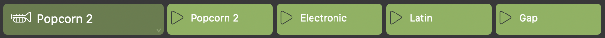 Eine Snippet-Gruppe bündelt eine Reihe von Snippets, die jeweils Parameter oder Phrasen für ein oder mehrere Instrumente enthalten. Es kann immer nur ein Snippet einer Gruppe abgespielt werden. Eine Gruppe wird in der ersten Spalte des Rasters als Schaltfläche mit dem Namen der Gruppe angezeigt.