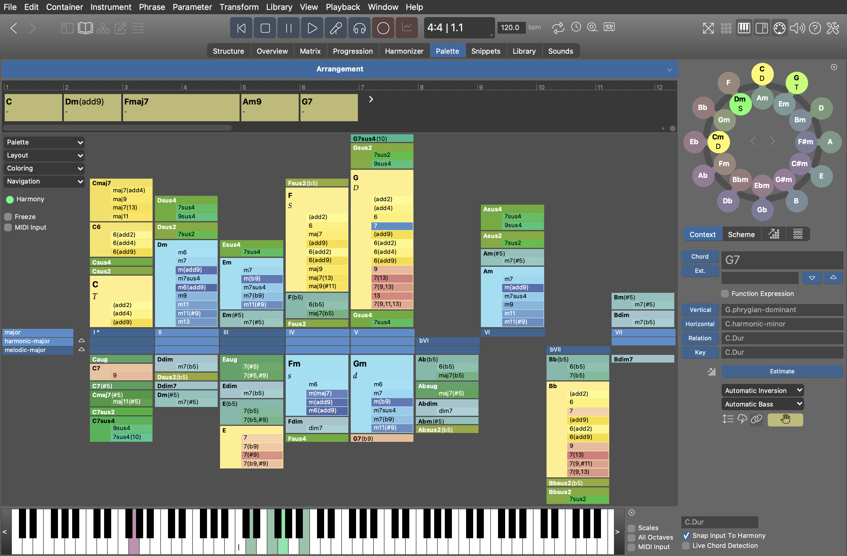Eine Palette mit allem Drum und Dran hilft dir, Akkorde, Skalen und Tonarten und ihre Beziehungen zu erkunden, während du den Harmony Parameter des aktuell ausgewählten Containers bearbeitest.