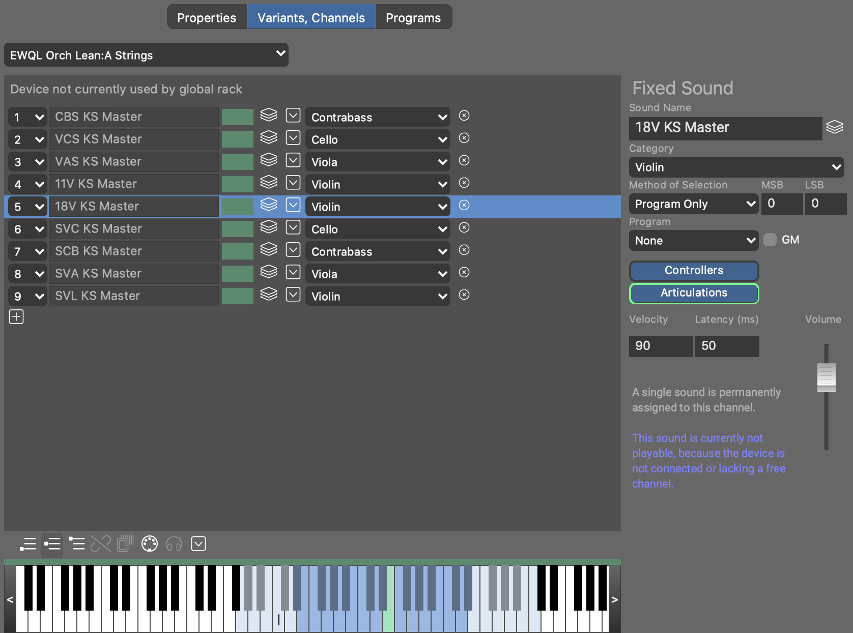 Für die meisten Geräte reicht ein einziger Anschluss mit 16 MIDI-Kanälen aus. Für umfangreiche Sound-Bibliotheken kannst du bis zu vier Varianten A, B, C, D hinzufügen. Jede Variante steht für eine andere Konfiguration, einen anderen Betriebsmodus oder eine andere Voreinstellung desselben Geräts und unterstützt bis zu 16 MIDI-Kanäle. Der Vorteil der Verwendung von Varianten gegenüber der Erstellung mehrerer Geräte ist, dass Benutzerdefinierte Controller, Artikulationen und Geräteeigenschaften nur einmal für alle Varianten definiert werden müssen.
