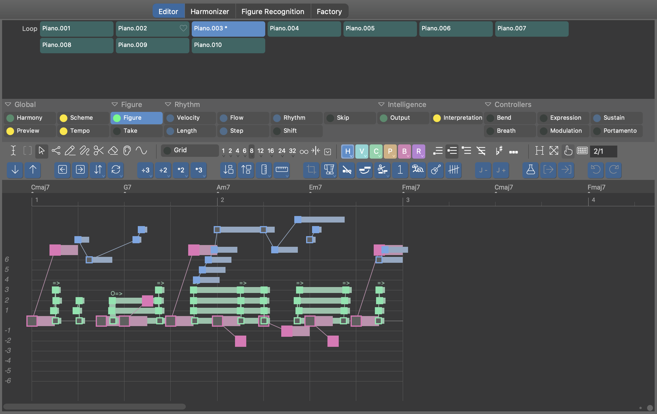 Die Seiten Editor, Harmonizer und Figurerkennung sind eine Hilfestellung für dich und konzentrieren sich jeweils auf eine bestimmte Aufgabe, die mit der Bearbeitung eines Pools verbunden ist. Unter Factory kannst du neue Phrasen erstellen.