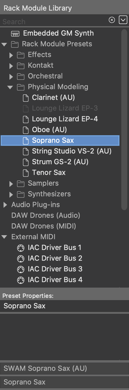 - Eingebetteter GM-Synthesizer: Ziehe ihn auf ein Instrument oder in ein Rack, wenn du einen Sound des eingebetteten Synthesizers verwenden möchtest. Der Vorteil ist, dass dein Arrangement oder deine Skizze auf jeder Installation von Synfire funktioniert und nicht von bestimmten Plug-ins abhängig ist. Dieser Eintrag ist ausgegraut, wenn der eingebettete Synthesizer deaktiviert ist.