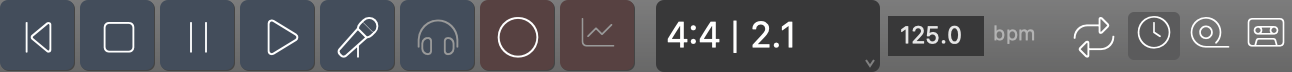 - Wiedergabe: Startet die Wiedergabe oder setzt sie fort(Leertaste). Wenn etwas auf dem Zeitlineal oder in einer Parameteransicht ausgewählt ist, beginnt die Wiedergabe von dort. Halte ⌥ Alt gedrückt, um nur Instrumente zu spielen, die im aktuellen Container mit Phrasen belegt sind.