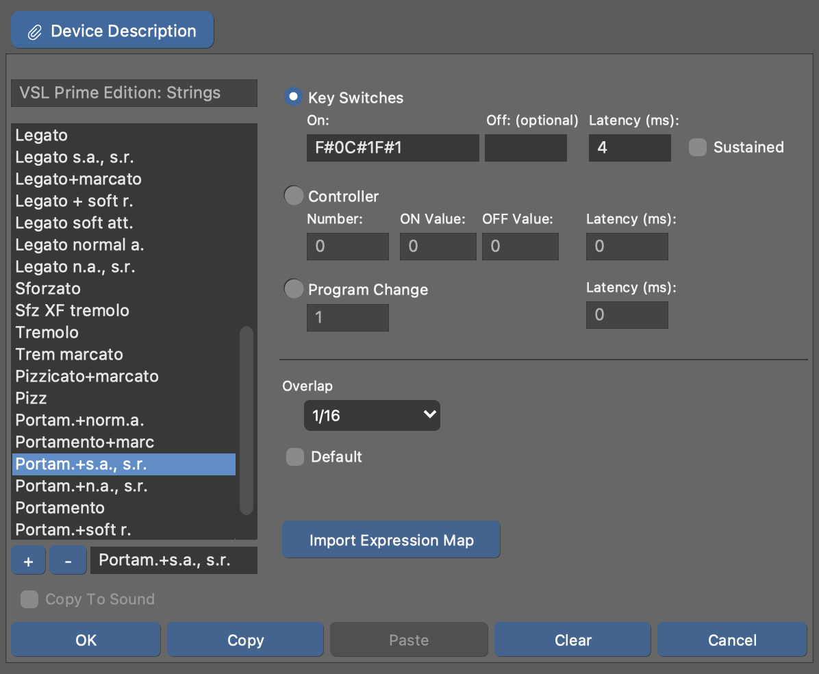 It is important to keep in mind that articulations are identified by name when you assign them to a Figure segment or symbol. Changing an articulation's name in a device description does not automatically update the Figures in all your arrangements. We recommend you don't change any imported names. This will also keep your arrangements compatible with those of other users that use the same sound library.