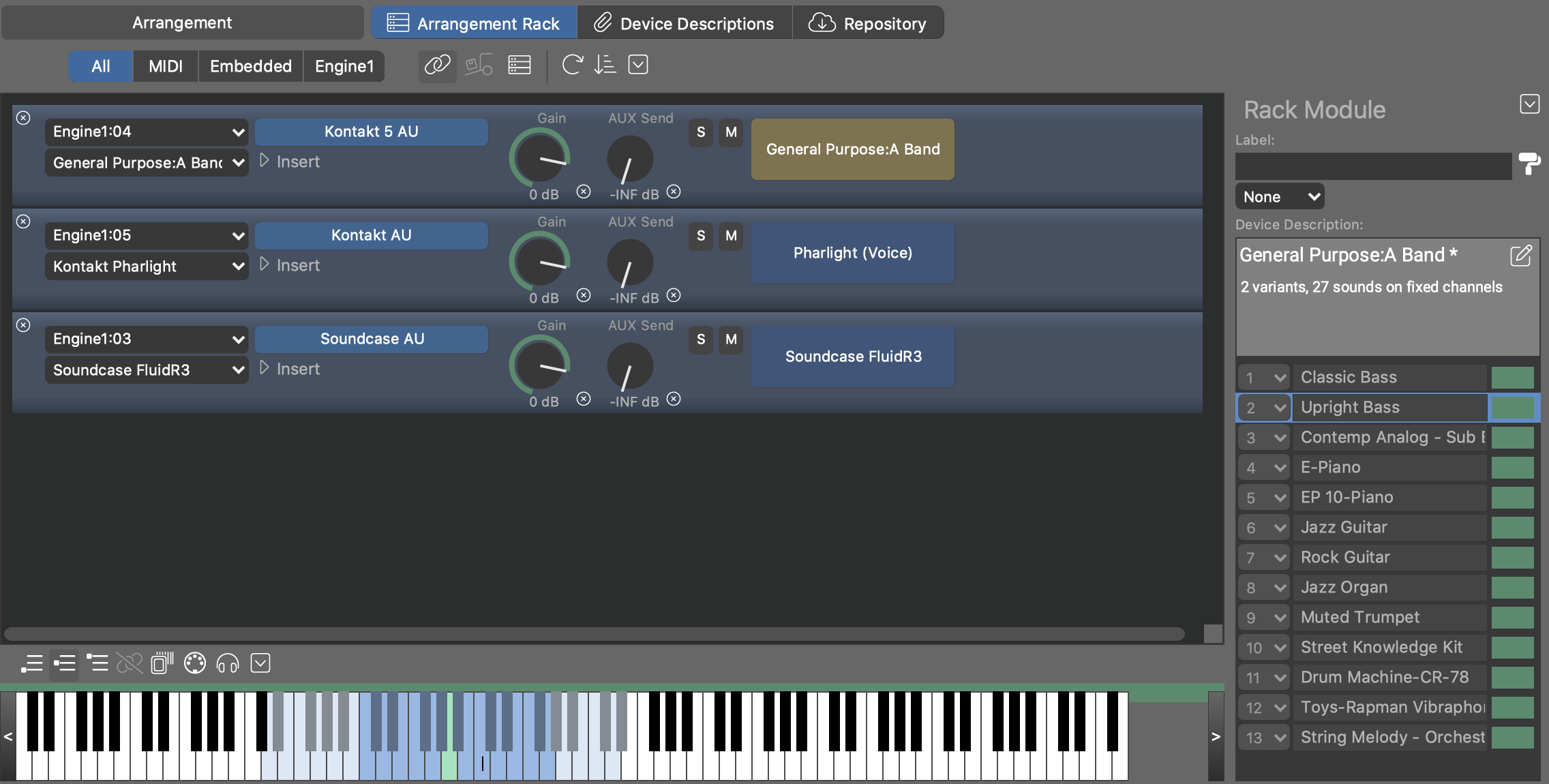 Select a module to see its contents on the right sidebar. Select a channel on the sidebar to open a Keyboard Widget where you can play a sound and examine its Playing Ranges.