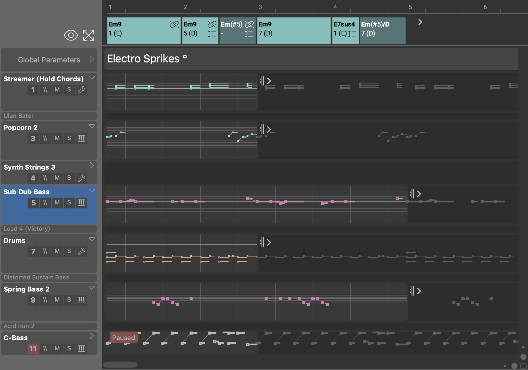 You can experiment with non-global parameters here, like Rhythm, Step, Transpose, Shift, to achieve dramatic effects when they apply to all instruments at the same time.