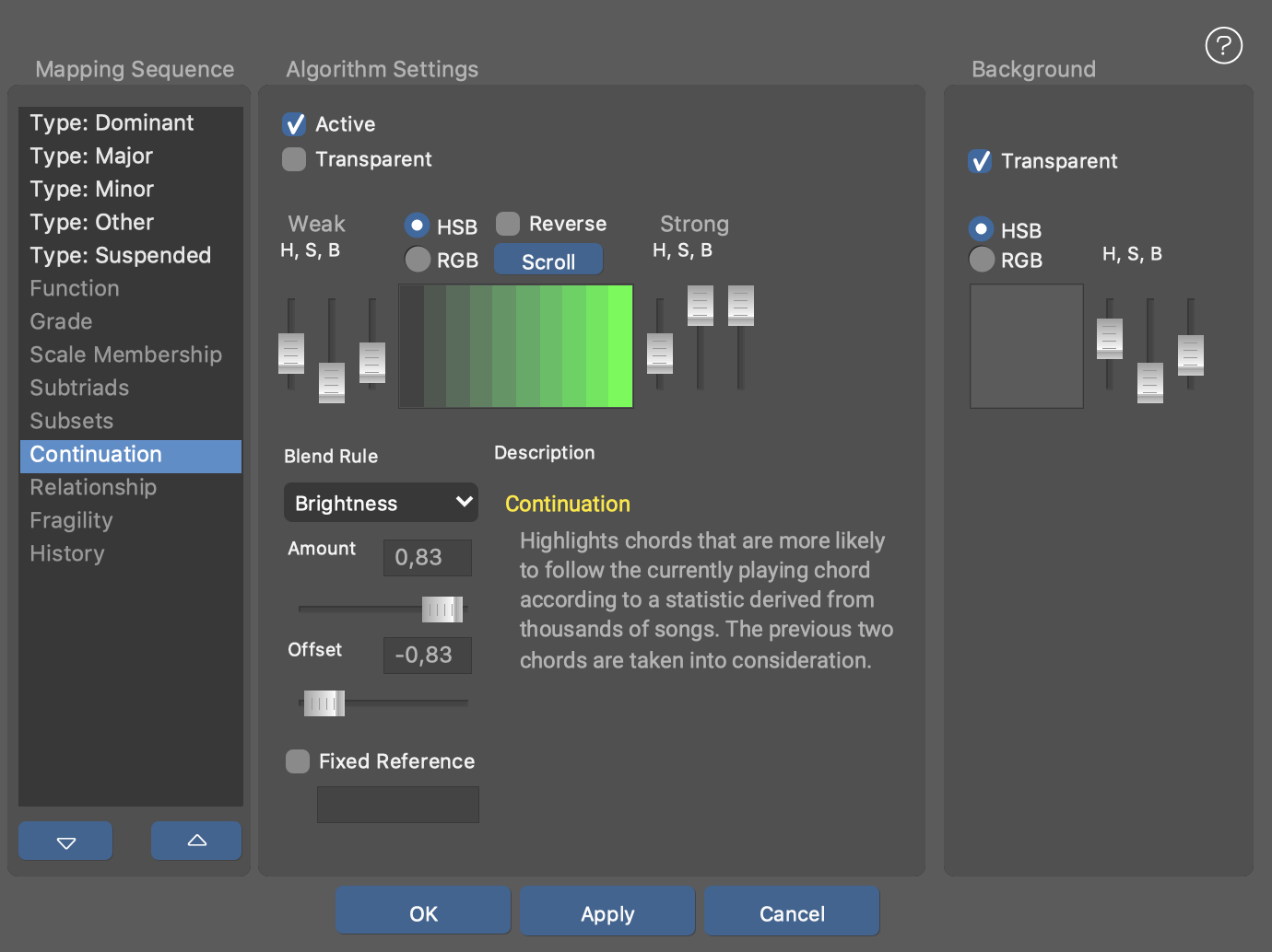 - Indicates the grade of relationship a chord has to the Scale Set of the palette. The brighter a chord, the closer its relationship to the reference scale.