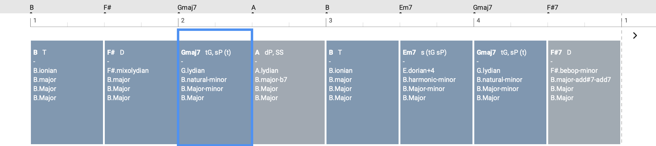 Der Harmony-Parameter enthält eine Progression, die für jeden Punkt auf der Zeitachse einen harmonischen Kontext bereitstellt. In Zusammenarbeit mit dem Parameter Interpretation steuert er das Rendering von Figure und anderen Parametern, um die endgültige MIDI-Ausgabe zu erzeugen.