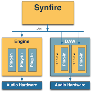 Synfire separates its user interface from the Audio Engine, which is running in the background and hosting all audio plug-ins. Both are separate processes that communicate with each other over the local area network. This allows for multiple engines to be run on different computers in your LAN.