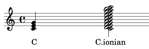 The Vertical Scale provides notes for melodic ornaments and improvisation. For each chord, a vertical scale can be picked according to preference and style. It is named vertical because its notes are stacked vertically above the current chord. Both, the chord and the vertical scale, start at the same root. It is important to remember that the vertical scale changes with every chord.