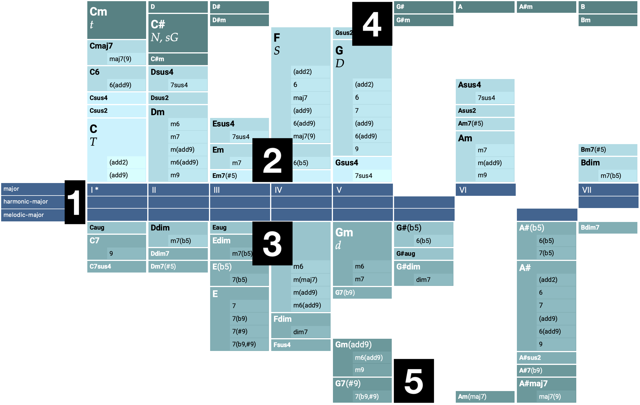 - Additional Chords at the bottom edge with only a weak or no relationship to the Tonal Center. Such chords offer interesting transitions to other keys or can add variation to a progression.