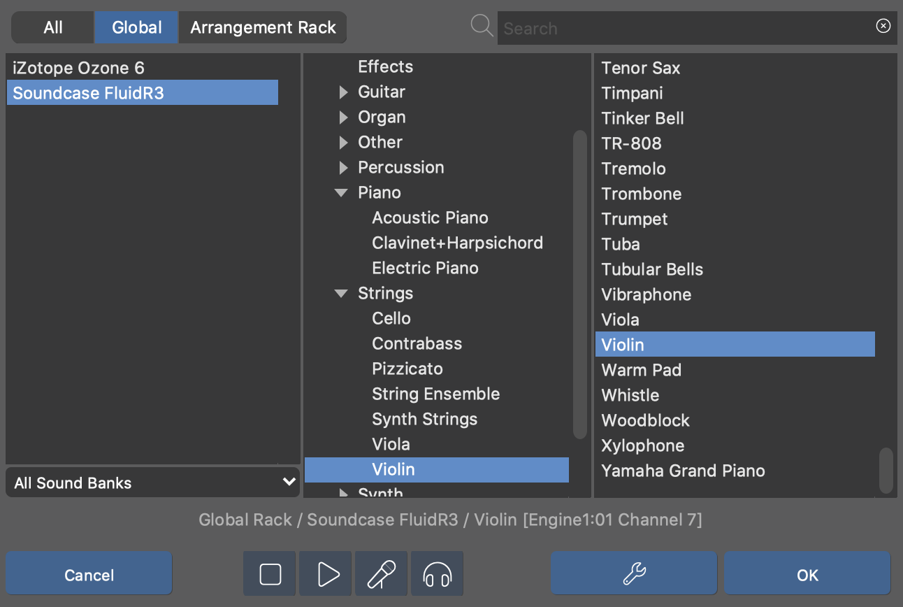 This page of the Sound Wizard lists all sounds currently provided by either the Global Rack or the local Arrangement Rack. Using the tabs All, Global and Arrangement Rack you can filter the list's contents selectively.