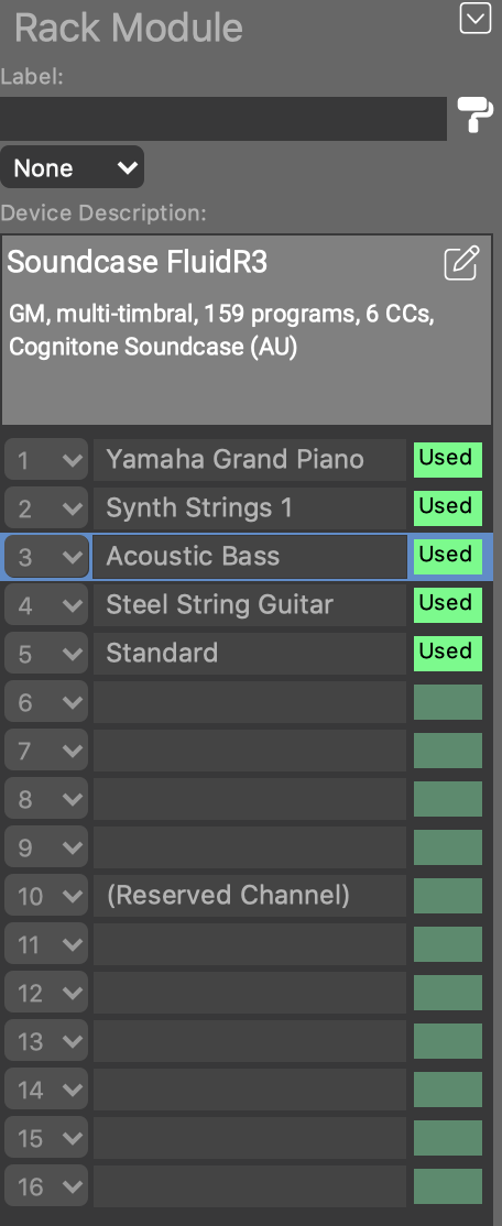 Shows a brief overview of the Device used in a Rack Module, listing its channels and which sounds are selected and used at this time.