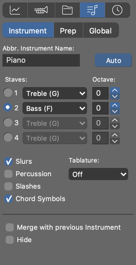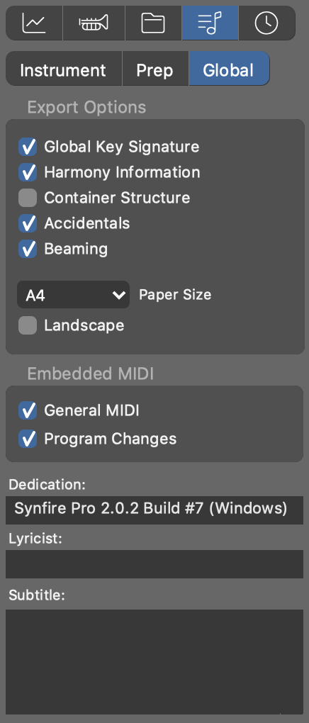 These settings apply to the exported notation file as a whole. Synfire remembers your last settings.