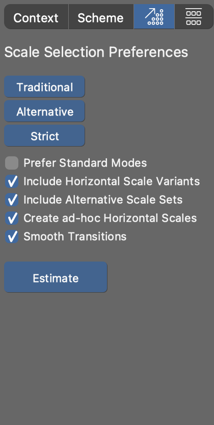 Synfire automatically selects suitable scales for a Harmonic Context if only a chord is known so far, or when a new estimation of keys and scales is requested. This selection is guided by the built-in knowledge base and your Scale Selection Preferences.