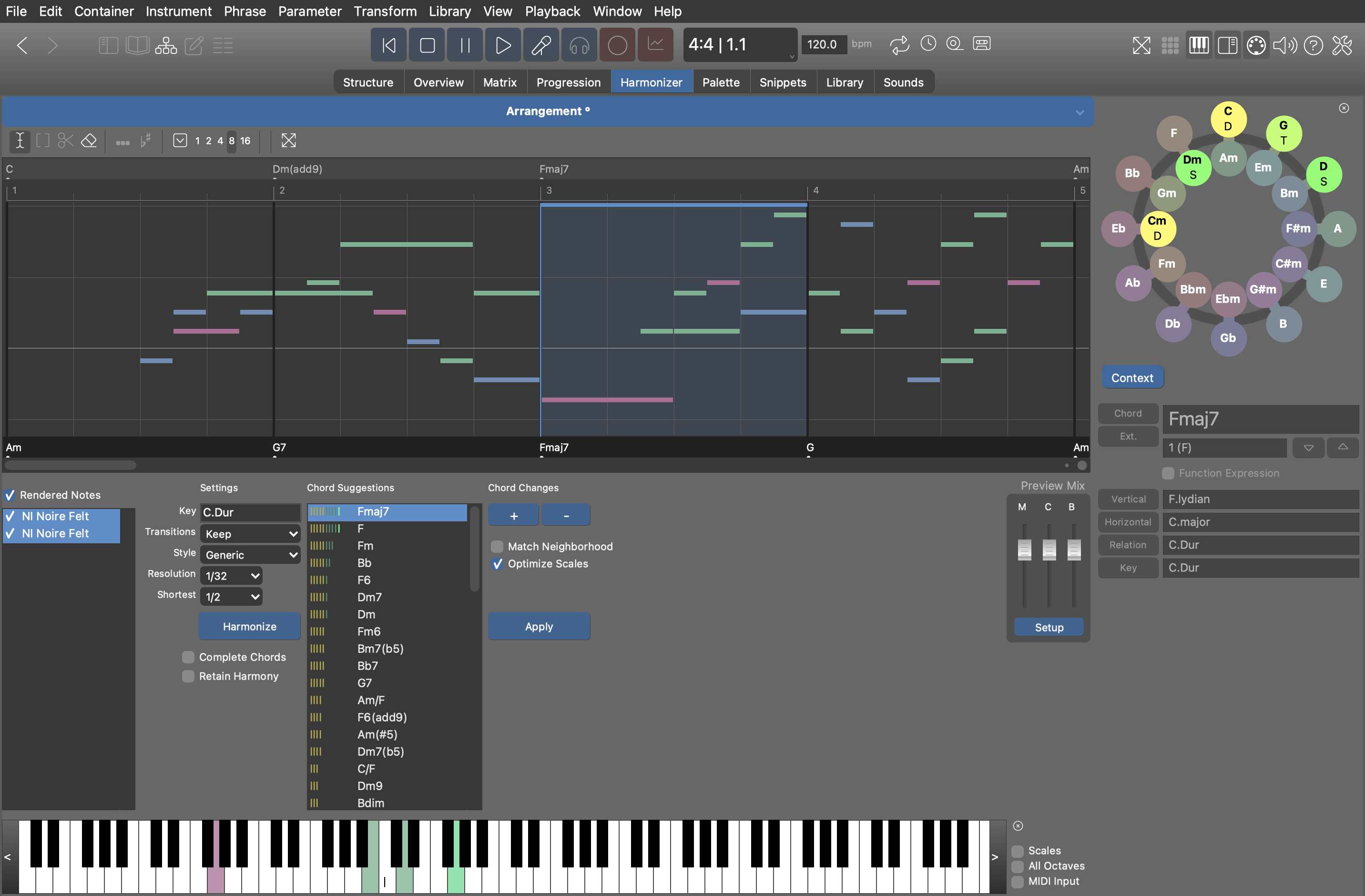 The Harmonizer looks into one or more Take buffers or rendered Output sequences in the current Container and suggests chords that match them best. When ready, you can save the resulting Harmony parameter to the container with Apply.