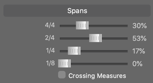The setting Crossing Measures allows spans to overlap measure bounds, which is good for melodies and weakens the pronunciation of beat.