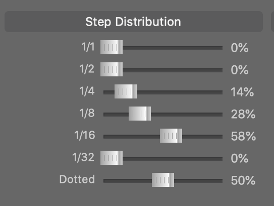 These probabilities are used by a Factory's rules, which take into account a lot more that simple random distributions in order to build a musically meaningful rhythm. Pulling either slider to 100% will give you a constant step.