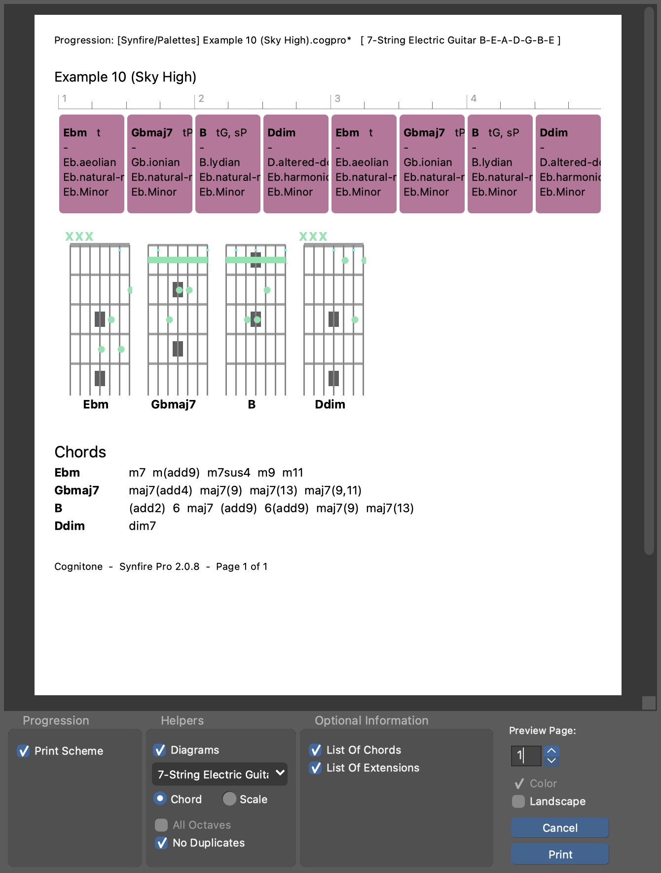 Synfire can currently print Palettes and Progressions. The command is enabled only on the Progression and Palette pages of the Arrangement App.