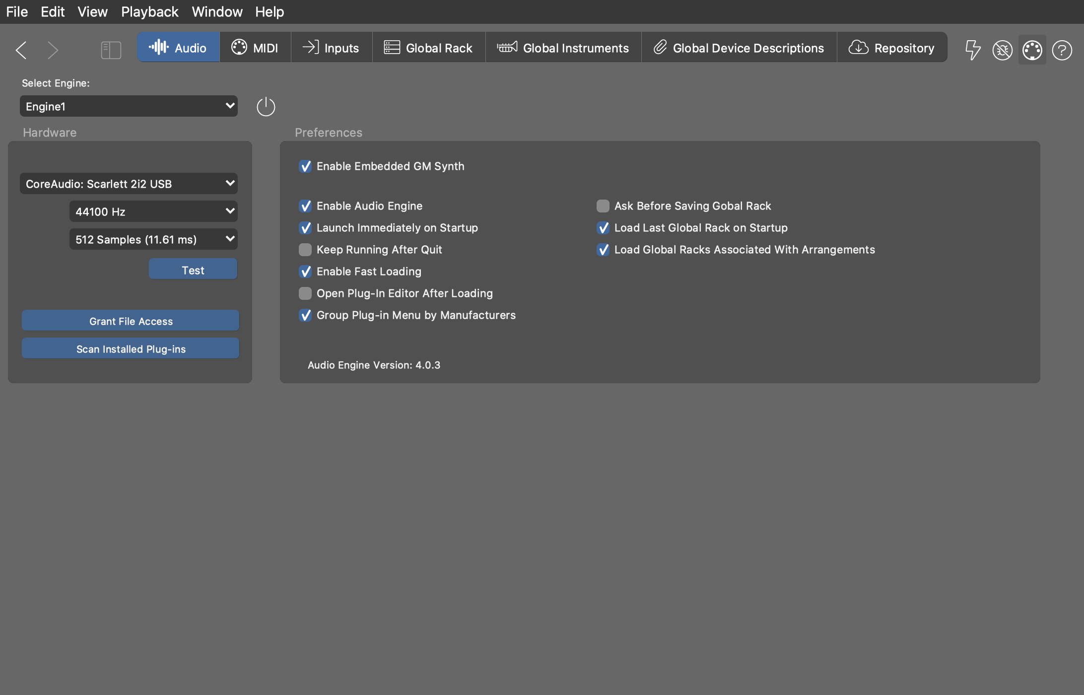 In diesem Fenster verwaltest du deine Audioeinstellungen, das Globale Rack, die globalen Gerätebeschreibungen und deine Globalen Instrumente. Es kann von jedem Fenster aus geöffnet werden, entweder über die Symbolleiste oder über die Wiedergabe > Audio/MIDI-Einrichtung.