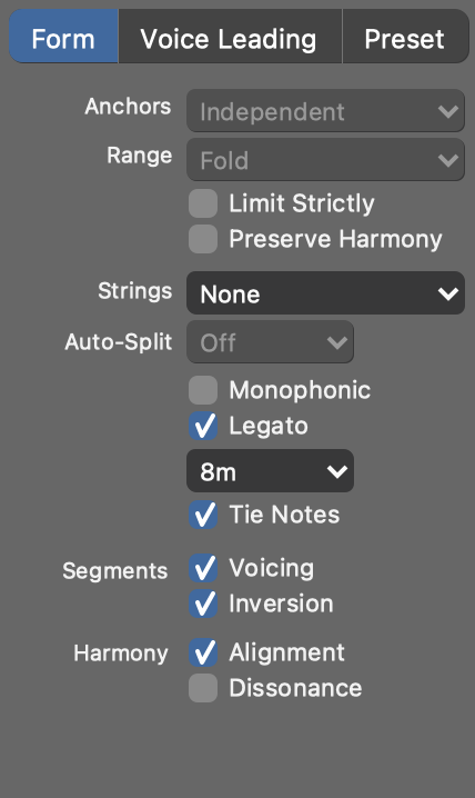 - Erlaube einzelnen Akkordsegmenten im Parameter Figure, die vom Parameter Harmony vorgeschlagene Stimmlage zu überschreiben.