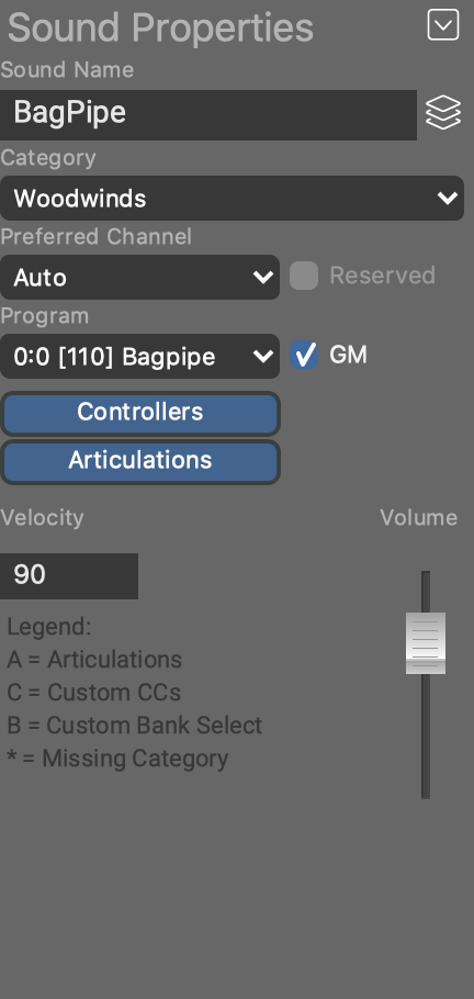 Die Nummer, die zur Auswahl des Sounds mit einer MIDI-Programmwechsel-Nachricht verwendet wird (1 - 128). Aktiviere das GM-Kästchen, wenn Programmwechsel und Instrumentenkategorie dem General-MIDI-Standard entsprechen.