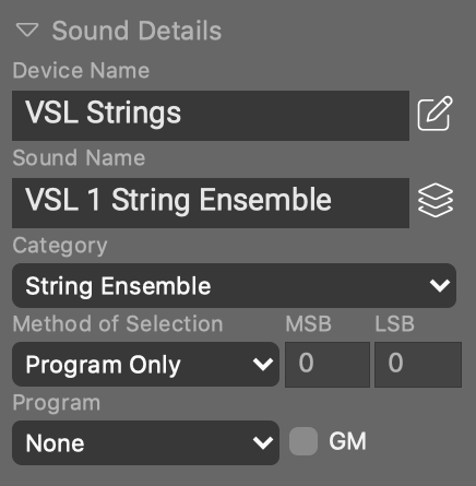 Einige Eigenschaften eines Sounds können im Parameterinspektor sichtbar gemacht und bearbeitet werden. Dieses Formular ist normalerweise schreibgeschützt (ausgegraut), es sei denn, du hast für die Gerätebeschreibung die Option Änderungen in Arrange-Ansicht erlauben aktiviert. Gerätebeschreibungen, die vom Sound Assistenten erstellt wurden, erlauben dies standardmäßig, so dass du die Eigenschaften eines Sounds ganz einfach ändern kannst, ohne den Geräteeditor zu besuchen.