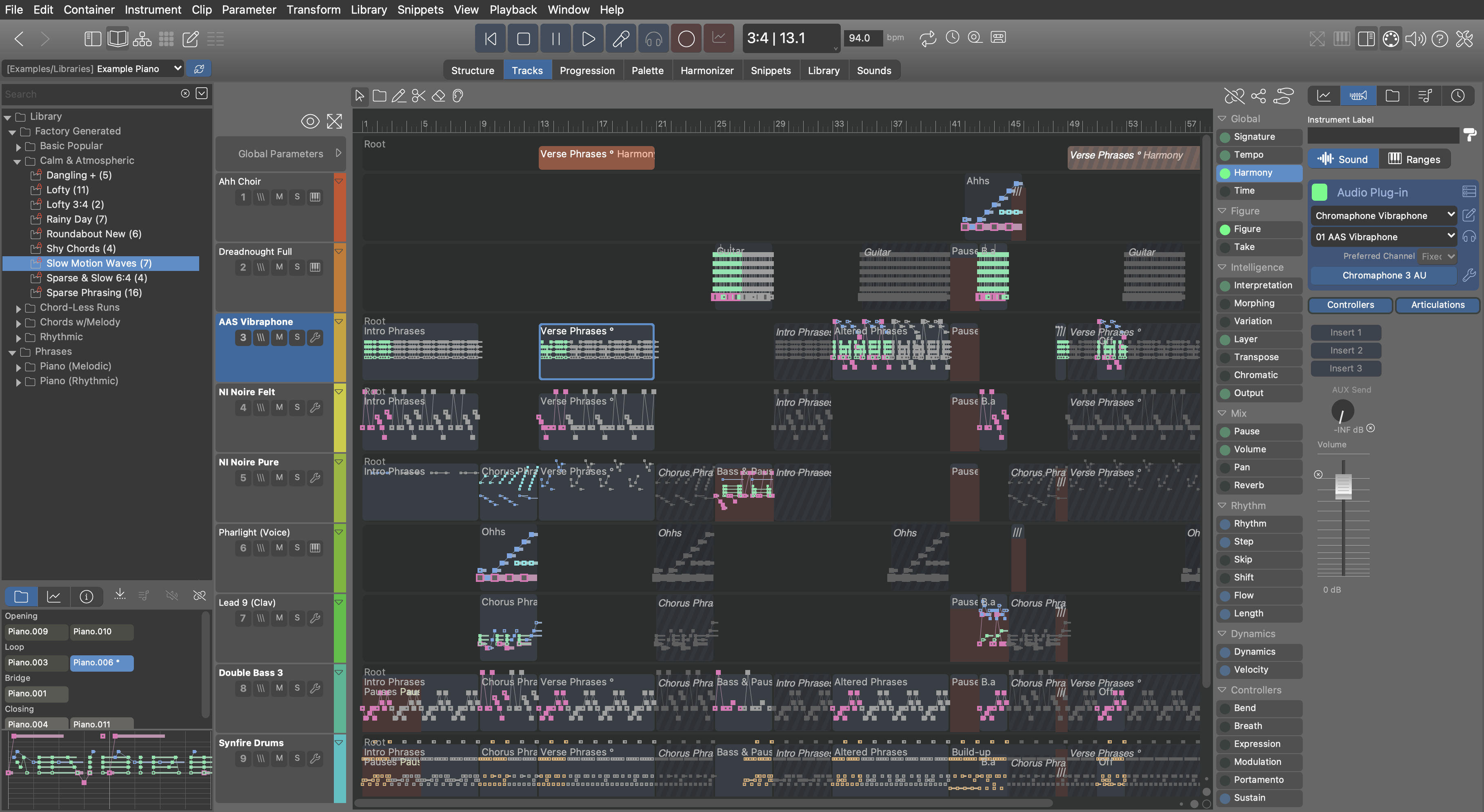 Diese Seite kommt dir vielleicht bekannt vor, weil sie einer DAW ähnelt. Hier siehst du auf einen Blick, welche Ausgaben die Container-Struktur für jedes einzelne Instrument erzeugt. Für jeden Container, in dem mindestens ein Parameter für ein Instrument festgelegt ist, wird hier ein Clip angezeigt. Alles was du auf der Struktur Seite machst wird hier automatisch angezeigt (und umgekehrt).