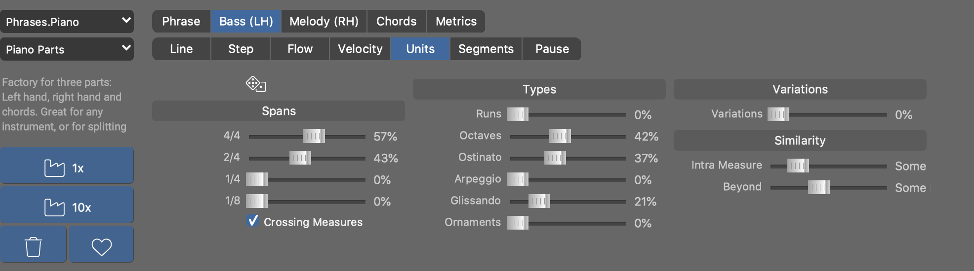 Wähle eine Factory aus den Aufklappmenüs aus, um neue Phrasen zu erzeugen, oder wähle eine bereits erzeugte Phrase aus, um ihre ursprünglichen Werkseinstellungen wieder aufzurufen. Jede erzeugte Phrase ist im Grunde eine neue Factory, von der du weitere Variationen erzeugen oder ihre Einstellungen ändern kannst, um eine neue Reihe von verschiedenen Phrasen zu erzeugen.