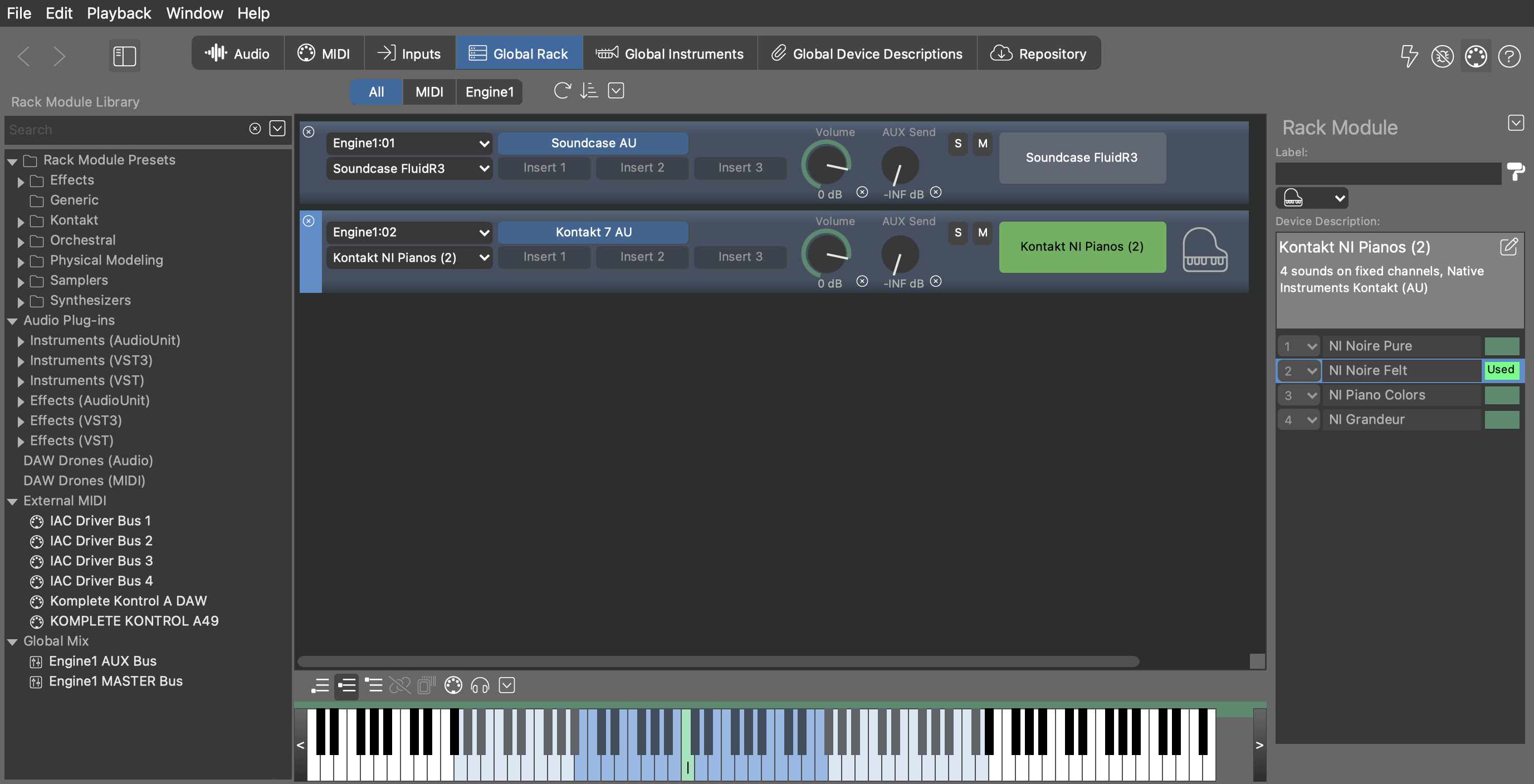 Auf dieser Seite siehst du das Globale Rack. Das Rack enthält Sounds, die allen geöffneten Arrangements und anderen Dateien gemeinsam zur Verfügung stehen. Hier erfährst du mehr über die Bearbeitung von Racks.