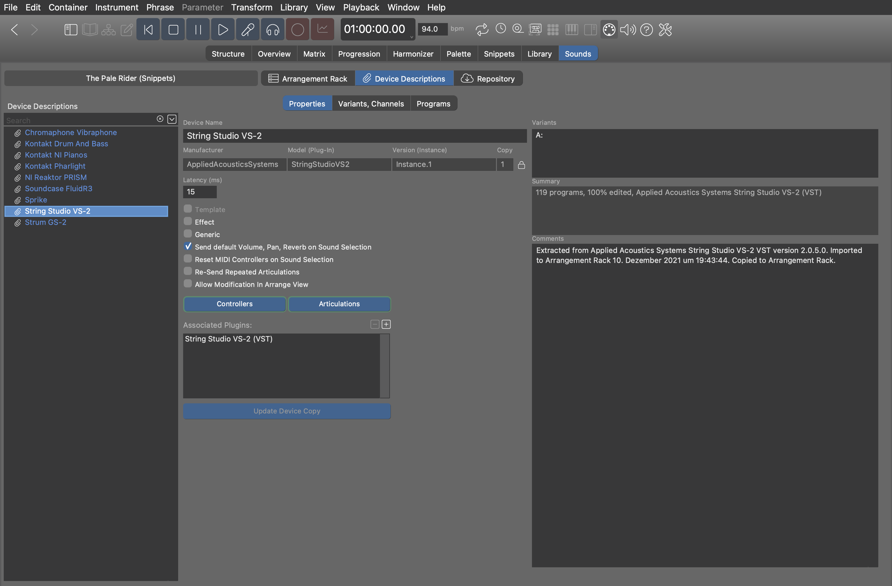 Auf der Registerkarte Gerätebeschreibungen verwaltest du deine Sammlung von Geräten. Geräte, die innerhalb eines Arrangements verwaltet werden, sind Teil dieses Arrangements. Sie können nicht von anderen Arrangements verwendet werden, es sei denn, du kopierst sie mit .
