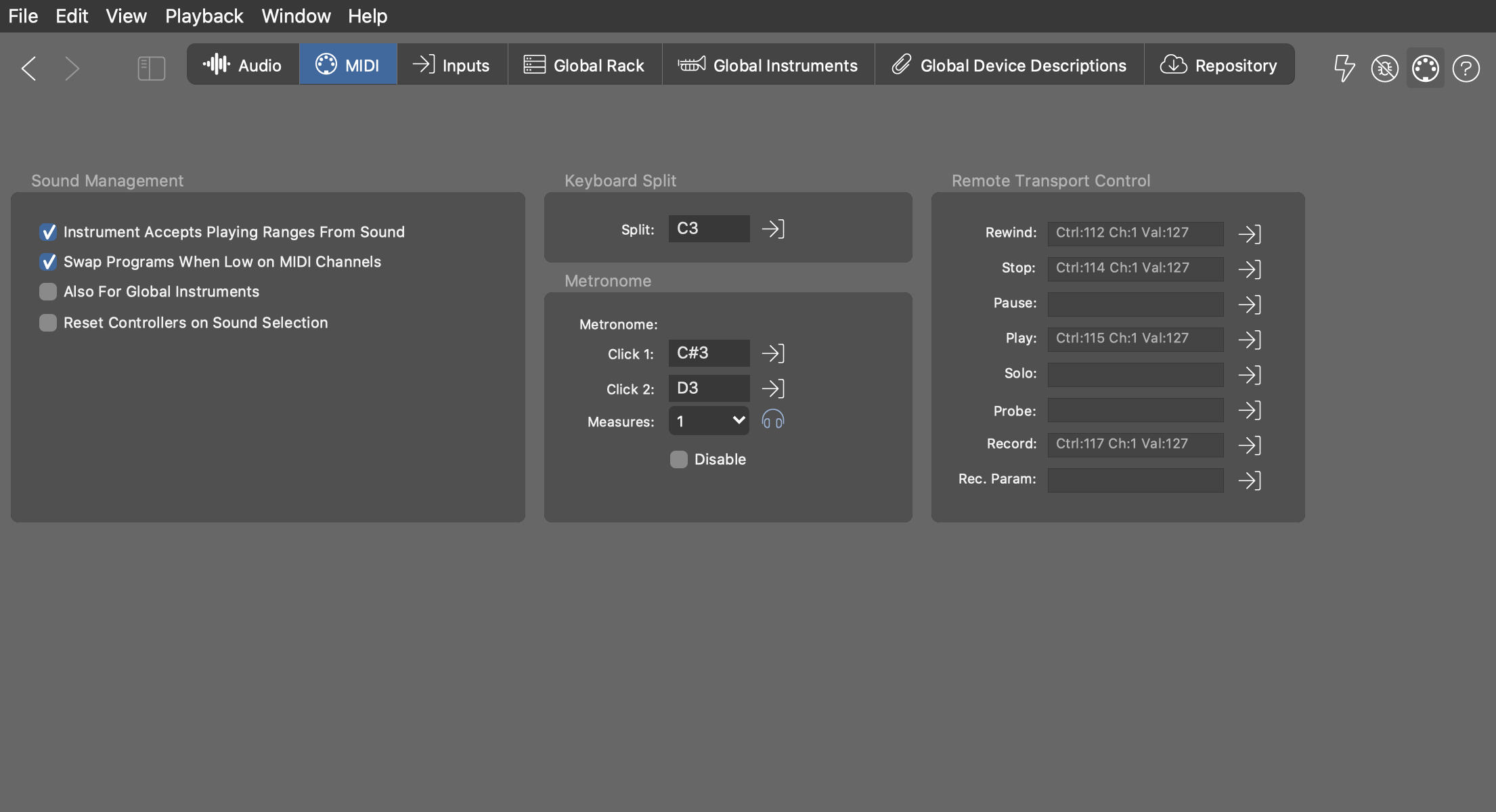 Auf dieser Seite stellst du die dynamische Sound-Zuweisung, den Keyboard-Split, das Metronom und die Fernsteuerung ein. Diese Konfiguration wird als Teil der Datei des Globalen Racks gespeichert.