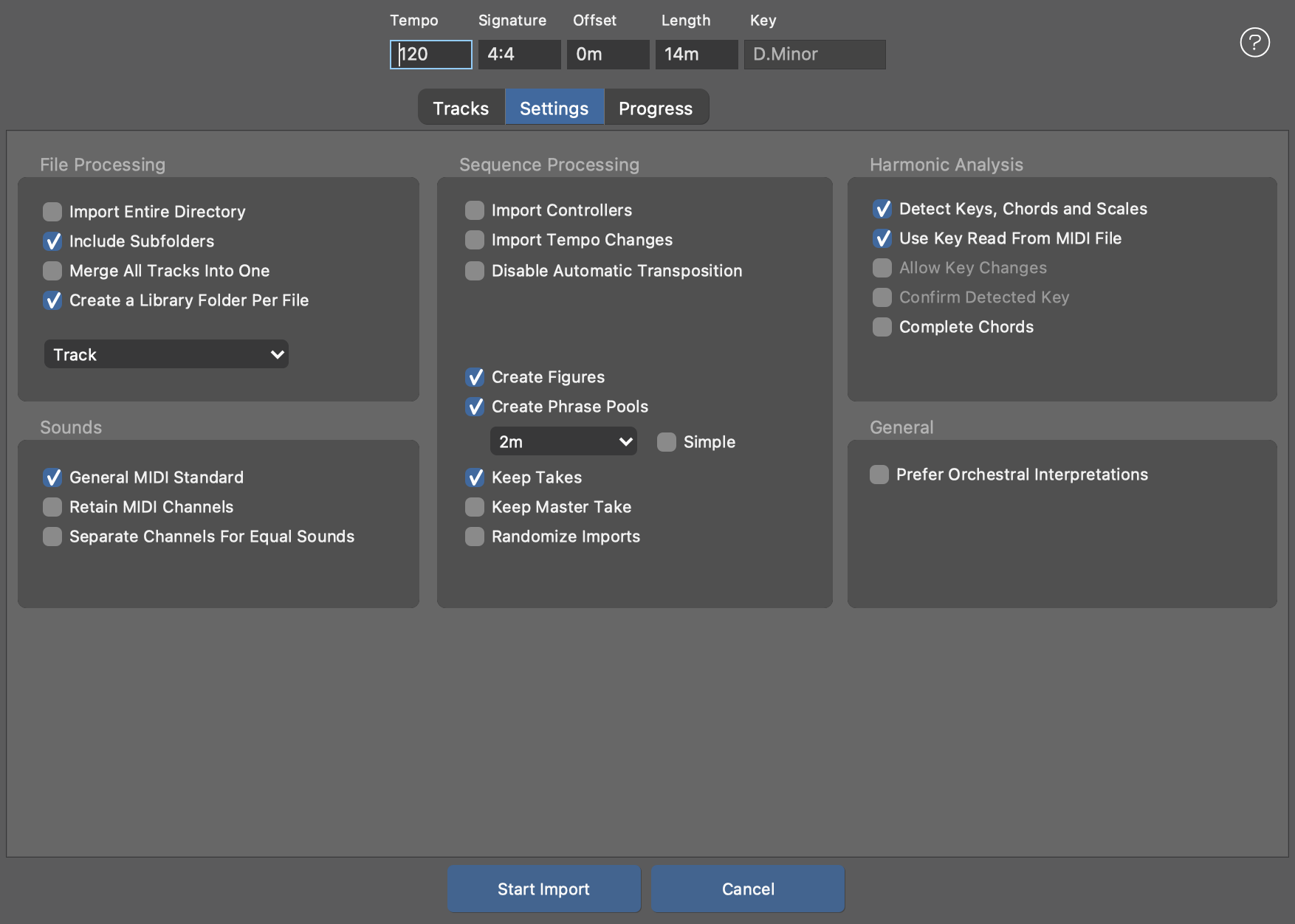 Press Start Import to start the process. Depending on the complexity of the file, this process can last for a long time. After import has finished, a new arrangement or library will open with the result.