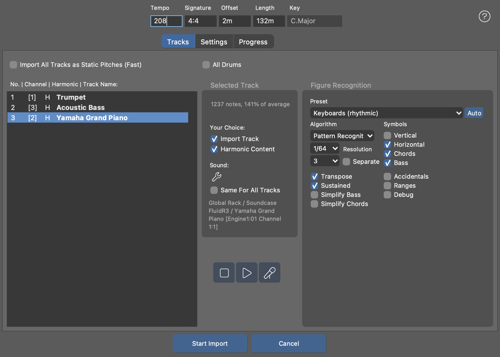 Configures all tracks to skip Figure Recognition. This is the fastest way to import a file. After the import has finished, you can go through each imported track or phrase and run the Harmonizer and Figure Recognition more selectively as needed on the Take parameter.