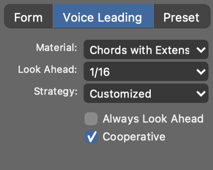 - For the inversion and voicing of chords, the previous chord is taken into account if this has been set in the Harmony parameter. Deactivate this to generate all chords independently of each other.