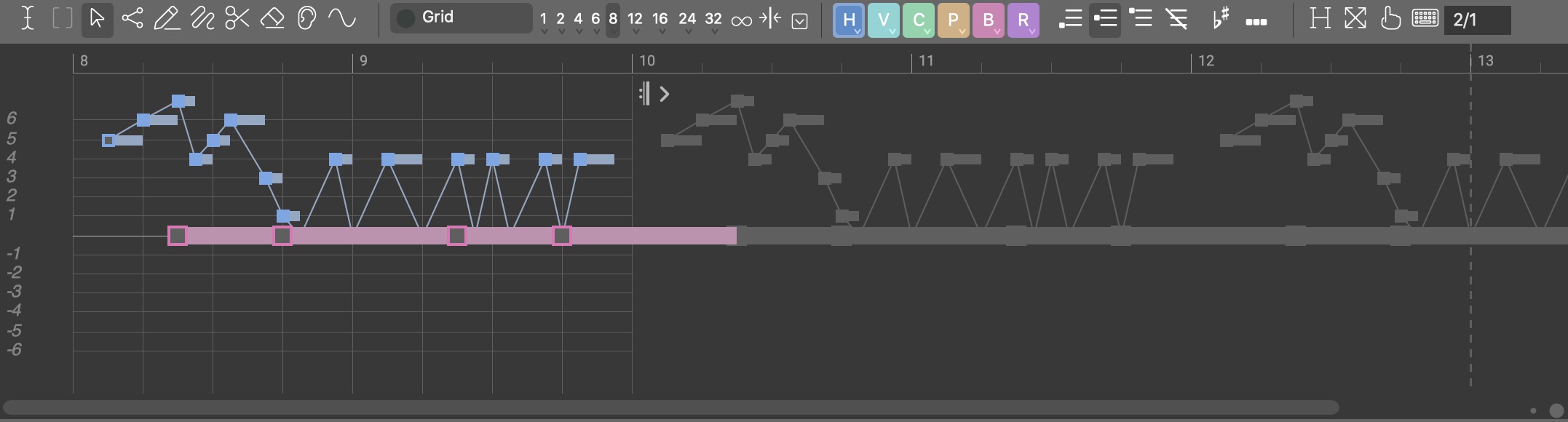 Hold Shift when you begin drawing in order to extend the nearest segment, or add parallel values to polyphonic parameters like Velocity.