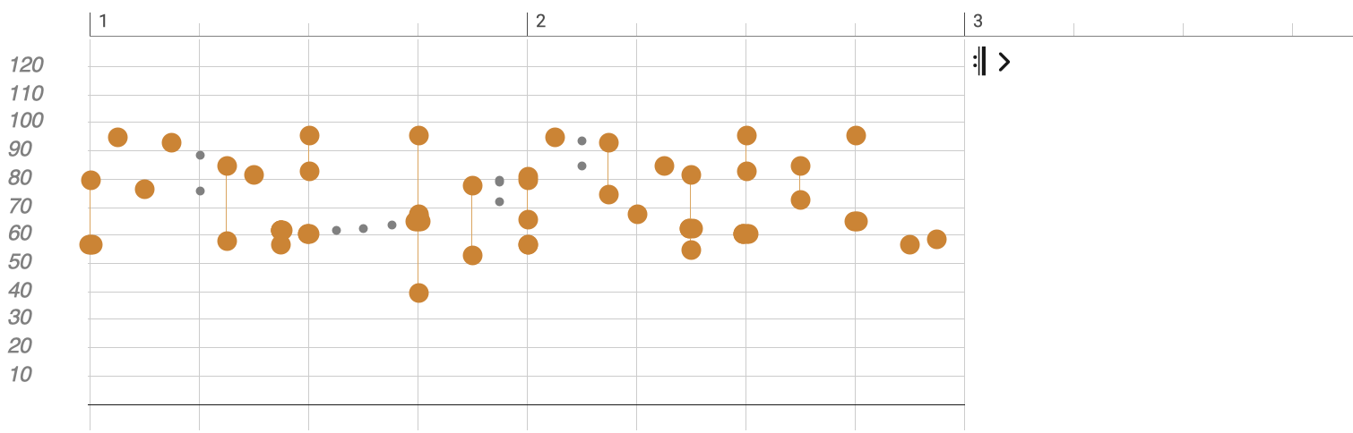 Der Velocity-Parameter überschreibt die Anschlags-Geschwindigkeiten der Figure Symbole. Er kann verwendet werden, um die Dynamik einer Phrase auf eine andere zu übertragen oder um die Dynamik über einen Bereich zu verändern, der länger ist als die Figur selbst.