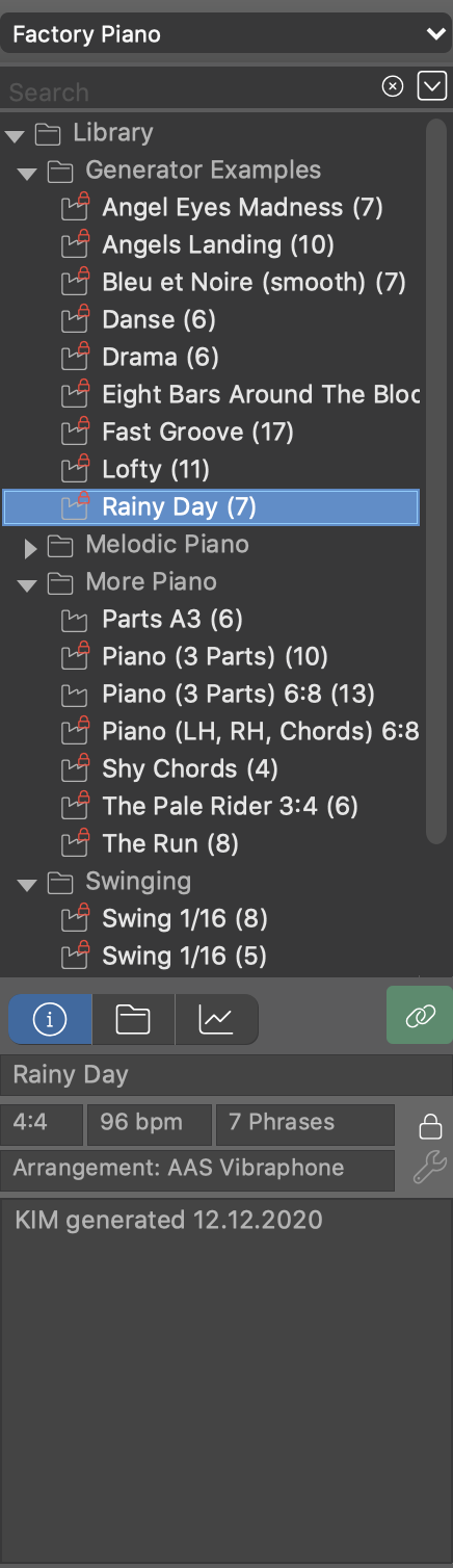 This part on the left sidebar lists all Phrase Pools in the currently selected Library. You can select the arrangement's own Embedded Library, or any external library file from the drop-down menu or the main menu.