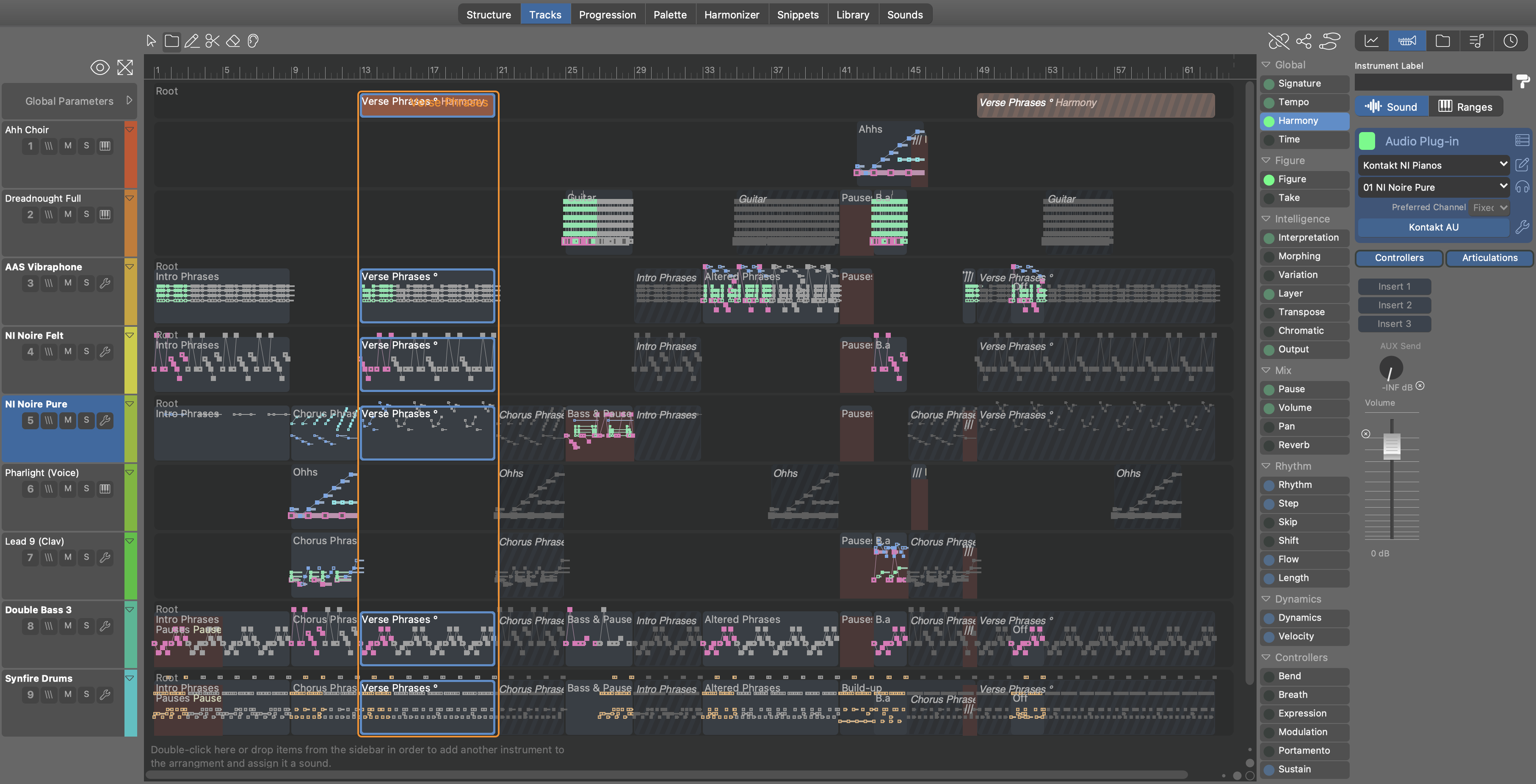 Track Sheet This view shows all clips for every instrument over the entire course of the arrangement.