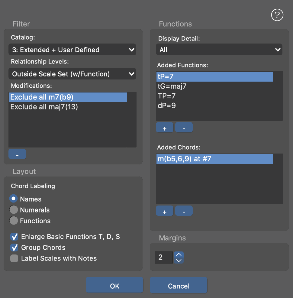 Names, Numerals or Functions Determines the way in which chord names are displayed. In Function mode, chords that have no significant function are filtered out, reducing the number of chords significantly.